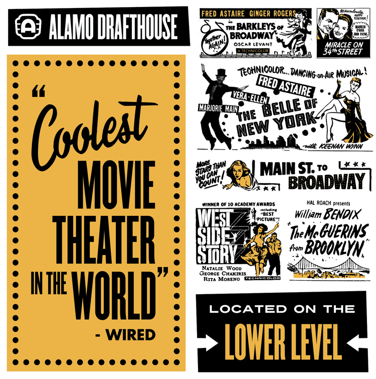 Social, web and print designs for the new Alamo Manhattan Press Room bar. Designs are inspired by the collection of vintage letterpress movie ads that are on display at the bar.
